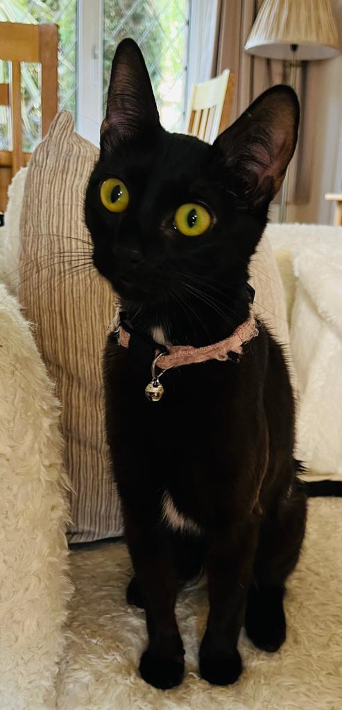 Bubbles is a little over a year old, a Bengal cross, like a little black Pantha, and is fealess and affectionate, prefering the company of humans to other animals .